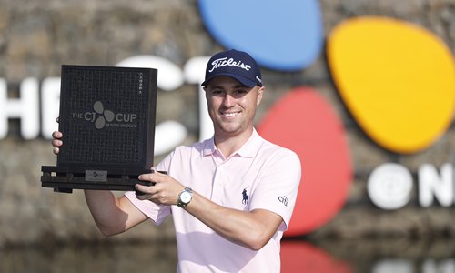 Justin Thomas of the USA holds up trophy after winning the CJ Cup at Nine Bridges PGA tour golf tournament at Nine Bridges Golf Club in Jeju, South Korea, 20 October 2019. Photo: IC