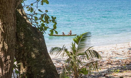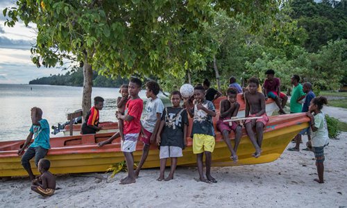 Boys row by the beach in Guadalcanal, Solomon Islands, Oct. 11, 2019. (Photo by Zhu Hongye/Xinhua)
