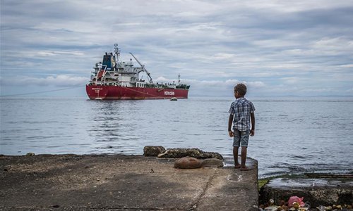 A boy watches a distant cargo ship in Honiara, Solomon Islands, Oct. 13, 2019. (Photo by Zhu Hongye/Xinhua)