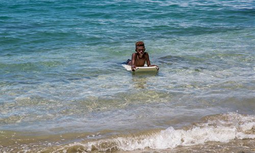 A boy surfs by the beach in Guadalcanal, Solomon Islands, Oct. 11, 2019. (Photo by Zhu Hongye/Xinhua)