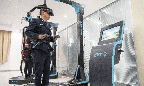A man demonstrates a VR simulated rescue drill system at a national hazardous chemicals emergency rescue base of Sinopec Zhongyuan Oilfield in Puyang, central China's Henan Province, Oct 16, 2019. Photo:Xinhua