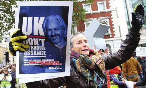 Demonstrators protest outside Westminster Magistrates Court in London on Monday where WikiLeaks founder Julian Assange has been attending a case management hearing as he fights extradition to the US. The 48-year-old Australian has been in custody at the high-security Belmarsh prison in southwest London since being dragged from Ecuador’s embassy in April. Photo: AFP
