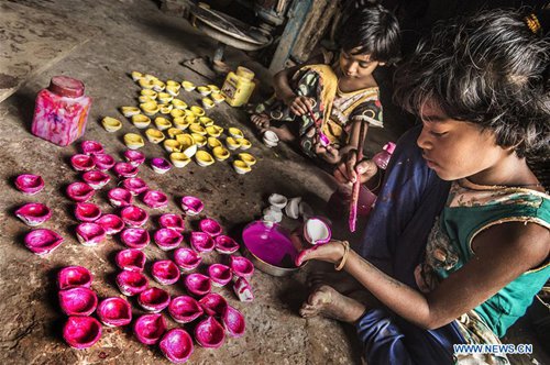 Children color earthen lamps for Diwali, the Hindu festival of lights, in Kolkata, India, Oct. 21, 2019. Diwali is the Hindu festival of lights which is celebrated all over the country. (Xinhua/Tumpa Mondal)
