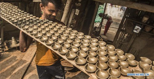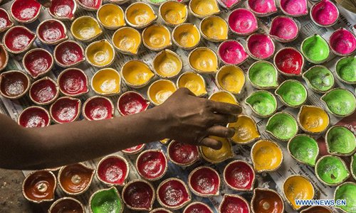 An Indian potter prepares earthen lamps for Diwali, the Hindu festival of lights, in Kolkata, India, Oct. 21, 2019. Diwali is the Hindu festival of lights which is celebrated all over the country. (Xinhua/Tumpa Mondal)