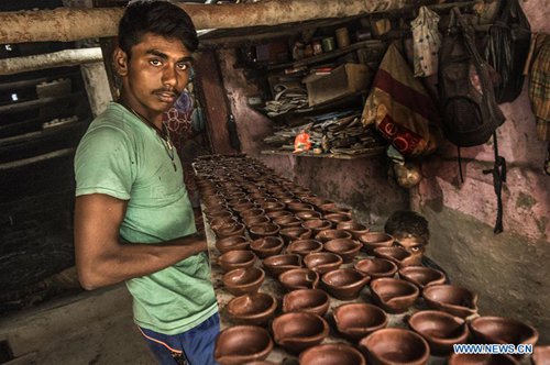 Indian potters prepare earthen lamps for Diwali, the Hindu festival of lights, in Kolkata, India, Oct. 21, 2019. Diwali is the Hindu festival of lights which is celebrated all over the country. (Xinhua/Tumpa Mondal)