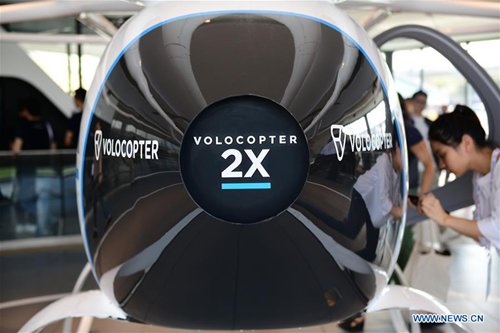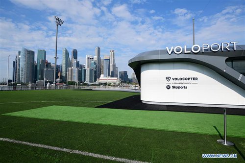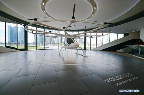 A two-seater Volocopter 2X is on display at the full scale prototype of the world's first air taxi vertiport VoloPort during the Intelligent Transport Systems World Congress at the Marina Bay Floating Platform in Singapore, Oct. 21, 2019. The world's first full-scale air taxi vertiport was unveiled here Monday on the sidelines of the congress. The VoloPort is the joint effort by Volocopter, the German urban air mobility and air taxi pioneer, and Skyports, the British vertiport developer, owner and operator. (Xinhua/Then Chih Wey)