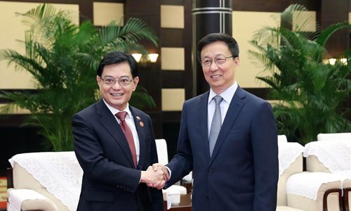 Chinese Vice Premier Han Zheng, also a member of the Standing Committee of the Political Bureau of the Communist Party of China Central Committee, meets with Singaporean Deputy Prime Minister Heng Swee Keat in Southwest China's Chongqing, October 15. Photo: Xinhua