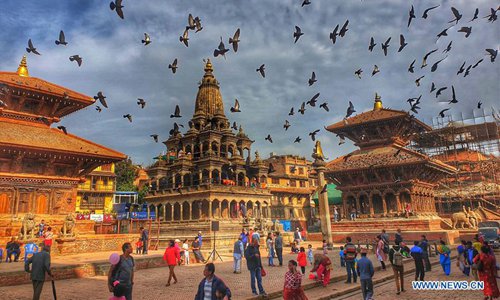 Photo taken on Oct. 23, 2019 shows pigeons flying as people visit Patan Durbar Square, a UNESCO World Heritage Site in Lalitpur, Nepal. (Photo by Sunil Sharma/Xinhua)