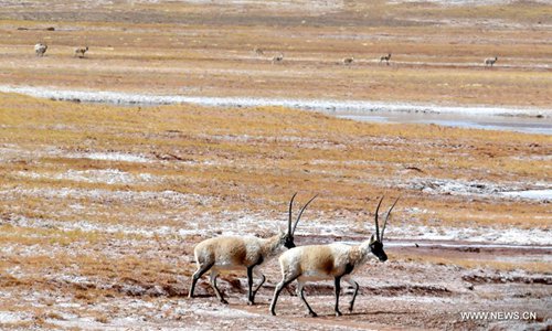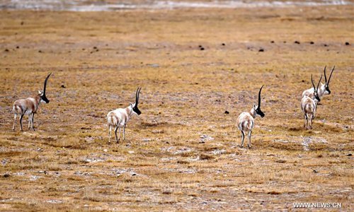 Tibetan antelopes are seen on a grassland in Shuanghu County of Nagqu, southwest China's Tibet Autonomous Region, Oct. 20, 2019. Shuanghu, the world's highest county with an average elevation of 5,000 meters, lies within the Qiangtang National Nature Reserve where many endangered wild animals live and breed. (Xinhua/Chogo)