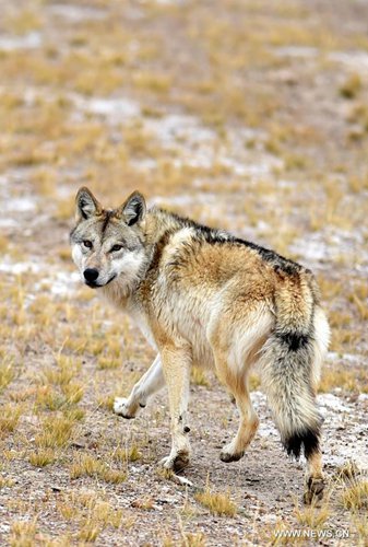 A wolf is seen on a grassland in Shuanghu County of Nagqu, southwest China's Tibet Autonomous Region, Oct. 20, 2019. Shuanghu, the world's highest county with an average elevation of 5,000 meters, lies within the Qiangtang National Nature Reserve where many endangered wild animals live and breed. (Xinhua/Chogo)