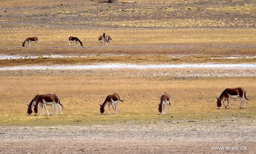 A group of kiangs (Equus kiang) graze on a grassland in Shuanghu County of Nagqu, southwest China's Tibet Autonomous Region, Oct. 20, 2019. Shuanghu, the world's highest county with an average elevation of 5,000 meters, lies within the Qiangtang National Nature Reserve where many endangered wild animals live and breed. (Xinhua/Chogo)