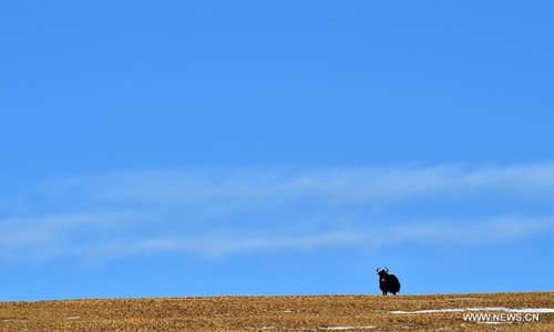 A wild yak is seen on a grassland in Shuanghu County of Nagqu, southwest China's Tibet Autonomous Region, Oct. 21, 2019. Shuanghu, the world's highest county with an average elevation of 5,000 meters, lies within the Qiangtang National Nature Reserve where many endangered wild animals live and breed. (Xinhua/Chogo)