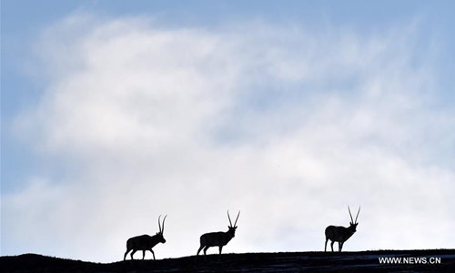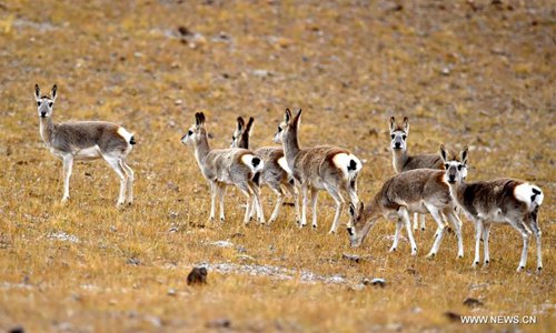Tibetan antelopes forage on a grassland in Shuanghu County of Nagqu, southwest China's Tibet Autonomous Region, Oct. 21, 2019. Shuanghu, the world's highest county with an average elevation of 5,000 meters, lies within the Qiangtang National Nature Reserve where many endangered wild animals live and breed. (Xinhua/Chogo)