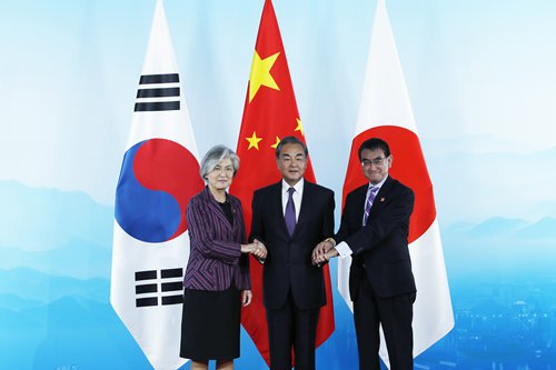 Chinese State Councilor and Foreign Minister Wang Yi (C) poses for a group photo with the Republic of Korea (ROK) Foreign Minister Kang Kyung-wha (L) and Japanese Foreign Minister Taro Kono in Beijing, capital of China, Aug 21, 2019. The ninth meeting of foreign ministers of China, Japan and the Republic of Korea (ROK) is held in China and Chinese State Councilor and Foreign Minister Wang Yi chaired the meeting.Photo: VCG