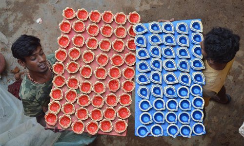 Indian potters deliver earthen lamps for Diwali, the Hindu festival of lights, in Bangalore, India, Oct. 24, 2019. Diwali is the Hindu festival of lights which is celebrated all over the country. (Xinhua/Stringer)