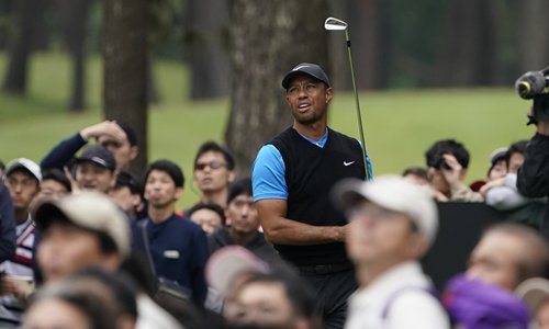 Tiger Woods watches his tee shot on the fifth hole during the third round of the Zozo Championship in Inzai, Japan on Sunday. Photo: AFP