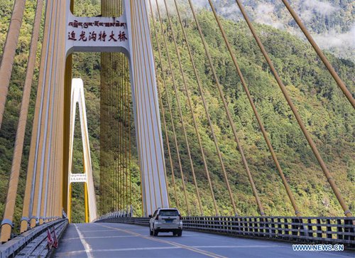 A car runs on the Polonggou grand bridge in Bomi County, Nyingchi of southwest China's Tibet Autonomous Region, Oct. 27, 2019. Polonggou grand bridge is the largest double pylon cable-stayed bridge in Tibet Autonomous Region. (Xinhua/Sun Fei)