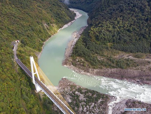 Aerial photo taken on Oct. 27, 2019 shows the Polonggou grand bridge in Bomi County, Nyingchi of southwest China's Tibet Autonomous Region. Polonggou grand bridge is the largest double pylon cable-stayed bridge in Tibet Autonomous Region. (Xinhua/Sun Fei)