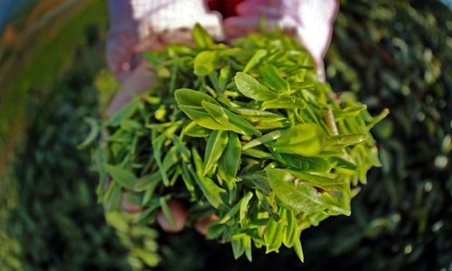 A tea farmer presents a handful of newly-picked tea leaves at the Lushan Yunwu Tea Base in Jiujiang City, east China's Jiangxi Province. (Xinhua/Zhang Haiyan)