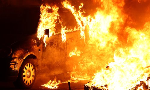 A car burns during a protest after a verdict in a trial over a banned Catalonia's independence referendum in Barcelona, Spain, October 16, 2019. Photo: VCG