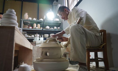 Xiong Guoan trims an unburnt porcelain bowl in Jingdezhen, east China's Jiangxi Province, Oct. 28, 2019. Xiong Guoan, an inheritor of thin body porcelain in Jingdezhen of Jiangxi, learnt the art from his father when he was 12 years old. Working in the field for 47 years, he insists for perfection in the making procedures. The shaping of the unburnt porcelain is the essence of the craft, during which craftsman will use tools to peel the unburnt porcelain until it can be penetrated by the light. Xiong's skill has allowed him to make thin body porcelain with a thickness of about 0.15 millimeter. (Xinhua/Zhou Mi)