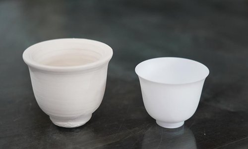 Photo taken on Oct. 28, 2019 in Jingdezhen, east China's Jiangxi Province, shows a finished thin body porcelain cup (R) is much thinner than the semi-finished one. Xiong Guoan, an inheritor of thin body porcelain in Jingdezhen of Jiangxi, learnt the art from his father when he was 12 years old. Working in the field for 47 years, he insists for perfection in the making procedures. The shaping of the unburnt porcelain is the essence of the craft, during which craftsman will use tools to peel the unburnt porcelain until it can be penetrated by the light. Xiong's skill has allowed him to make thin body porcelain with a thickness of about 0.15 millimeter. (Xinhua/Zhou Mi)