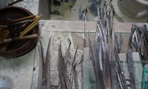 Tools of Xiong Guoan to trim porcelain embryo are seen in Jingdezhen, east China's Jiangxi Province, Oct. 28, 2019. Xiong Guoan, an inheritor of thin body porcelain in Jingdezhen of Jiangxi, learnt the art from his father when he was 12 years old. Working in the field for 47 years, he insists for perfection in the making procedures. The shaping of the unburnt porcelain is the essence of the craft, during which craftsman will use tools to peel the unburnt porcelain until it can be penetrated by the light. Xiong's skill has allowed him to make thin body porcelain with a thickness of about 0.15 millimeter. (Xinhua/Zhou Mi)