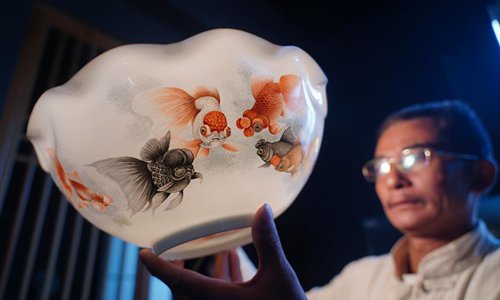 Xiong Guoan checks a thin body porcelain bowl he made in Jingdezhen, east China's Jiangxi Province, Oct. 28, 2019. Xiong Guoan, an inheritor of thin body porcelain in Jingdezhen of Jiangxi, learnt the art from his father when he was 12 years old. Working in the field for 47 years, he insists for perfection in the making procedures. The shaping of the unburnt porcelain is the essence of the craft, during which craftsman will use tools to peel the unburnt porcelain until it can be penetrated by the light. Xiong's skill has allowed him to make thin body porcelain with a thickness of about 0.15 millimeter. (Xinhua/Zhou Mi)