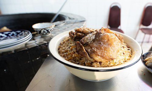 Photo taken on Oct. 29, 2019 shows the cooked plov in Central Asian Plov Centre in Tashkent, Uzbekistan. Plov is a traditional Uzbek food, consisting of rice, carrots and meat and often cooked in a traditional cast-iron pot. In different regions of Uzbekistan, people have their own recipes to cook plov with various ingredients. (Xinhua/Bai Xueqi)