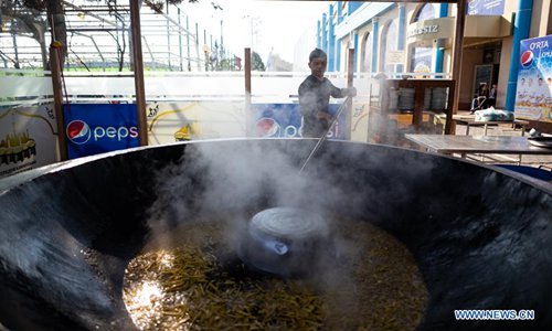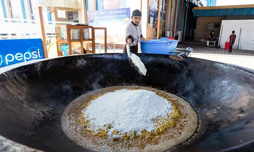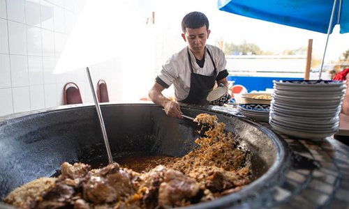 A man cooks plov in Central Asian Plov Centre in Tashkent, Uzbekistan, Oct. 29, 2019. Plov is a traditional Uzbek food, consisting of rice, carrots and meat and often cooked in a traditional cast-iron pot. In different regions of Uzbekistan, people have their own recipes to cook plov with various ingredients. (Xinhua/Bai Xueqi)