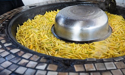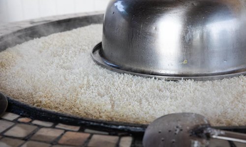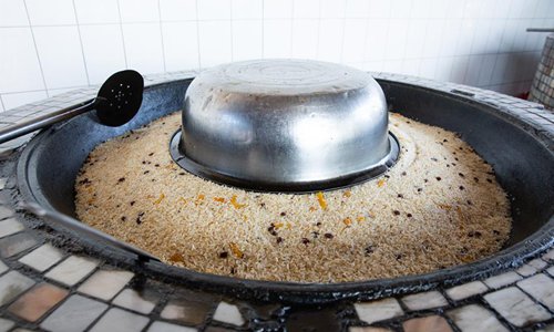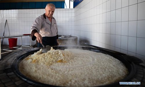 Photo taken on Oct. 29, 2019 shows the unfinished plov in Central Asian Plov Centre in Tashkent, Uzbekistan. Plov is a traditional Uzbek food, consisting of rice, carrots and meat and often cooked in a traditional cast-iron pot. In different regions of Uzbekistan, people have their own recipes to cook plov with various ingredients. (Xinhua/Bai Xueqi)