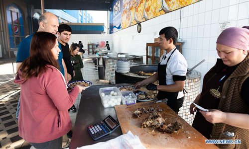People buy plov in Central Asian Plov Centre in Tashkent, Uzbekistan, Oct. 29, 2019. Plov is a traditional Uzbek food, consisting of rice, carrots and meat and often cooked in a traditional cast-iron pot. In different regions of Uzbekistan, people have their own recipes to cook plov with various ingredients. (Xinhua/Bai Xueqi)