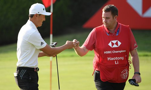 Li Haotong (left) fist bumps with his caddie during Day 1 of the WGC-HSBC Champions on Thursday in Shanghai. Photo: VCG