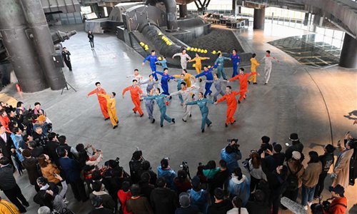 People watch dancers performing during a dance show at the Shougang Park in Beijing, capital of China, Nov. 2, 2019. A two-day dance show is held at the Shougang Park, a former steel plant, in Beijing. Photo: Xinhua