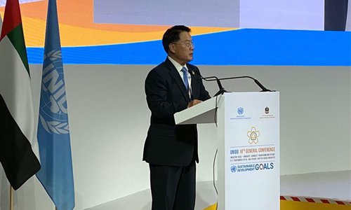 Li Yong, Director General of the United Nations Industrial Development Organization (UNIDO), addresses the opening ceremony of the 18th session of the General Conference of the United Nations Industrial Development Organization (UNIDO) in Abu Dhabi, the United Arab Emirates, on Nov. 3, 2019. The 18th session of the General Conference of the United Nations Industrial Development Organization (UNIDO) opened here on Sunday. The conference will look into the key role of inclusive and sustainable industrial development to achieve the Agenda 2030, in particular in the context of the Fourth Industrial Revolution. Photo: Xinhua