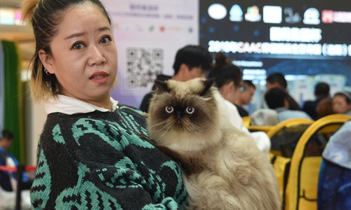 A woman holds her long-haired cat at a cat exhibition held by Chinese Administrative Association of Cats in Luoyang, Central China's Henan Province on Saturday. Photo: VCG