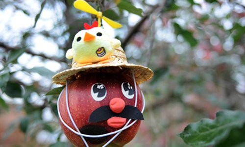 An apple that's still on the tree in Changping district of Beijing is just one of many in the orchard that has been given a hat and face. Photo: VCG