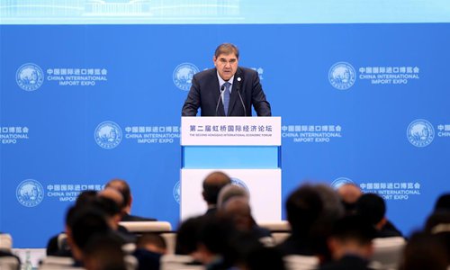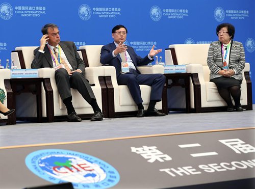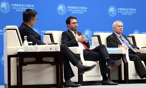 Bertrand Austruy (C), general secretary and executive president of Danone, speaks at the parallel session "WTO Reform and Free Trade Agreements" of the second Hongqiao International Economic Forum in Shanghai, east China, Nov. 5, 2019. (Xinhua/Liu Ying)