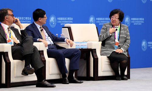 Zhang Yujiao (R), former chair and judge of WTO Appellate Body, speaks at the parallel session "WTO Reform and Free Trade Agreements" of the second Hongqiao International Economic Forum in Shanghai, east China, Nov. 5, 2019. (Xinhua/Liu Ying)