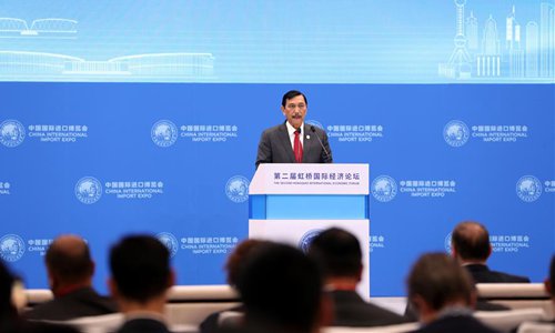 Indonesian Coordinating Minister for Maritime Affairs Luhut Binsar Pandjaitan addresses the parallel session "WTO Reform and Free Trade Agreements" of the second Hongqiao International Economic Forum in Shanghai, east China, Nov. 5, 2019. (Xinhua/Liu Ying)