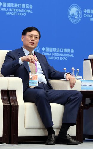 Yang Yuanqing, chairman and chief executive officer of Lenovo, speaks at the parallel session "WTO Reform and Free Trade Agreements" of the second Hongqiao International Economic Forum in Shanghai, east China, Nov. 5, 2019. (Xinhua/Liu Ying)