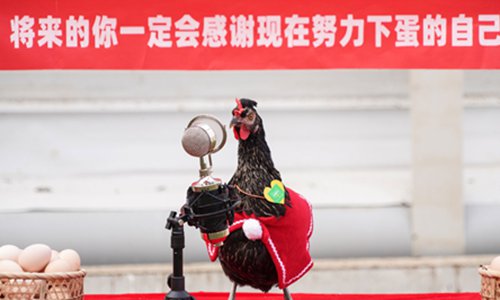 A chicken appears to be standing in front of a microphone announcing its farm's goal for this year's Double 11 shopping spree - 1 million eggs. The banner in the background offers this proverb: Thank yourself in the future for laying eggs today. Photo: IC