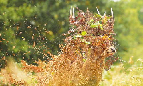 A beautiful stag is raising his head from the foliage with all manner of leaves and twigs clinging to his antlers like a wig in Bushy Park, London at the tail end of the UK's rutting season. With foliage wrapped around his antlers, the hapless stag is clearly having a bad hair day. Photo: VCG