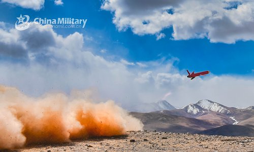 An unmanned aerial vehicle (UAV) attached to an air-defense brigade under the PLA Xizang Military Command is launched for reconnaissance in mock hostile targeted airspace during a recent live-fire training operation at the altitude of 4,500 meters in southwestern China's Xizang Autonomous Region. The brigade conducts such training subjects as long-distance and round-the-clock real combat live-fire training operation, reconnaissance, electronic interference operation, and so on, in order to test troops’ air-defense capabilities.Photo: China Military
