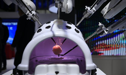 The Da Vinci surgical scalpel made by Shanghai Fosun Pharmaceuticals delicately clips the petals off a rose. Photo: Yang Hui/GT
