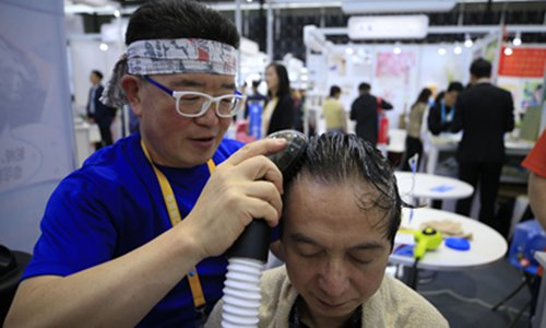A hairdresser demonstrates a machine from Japan that washes hair without water and needs just five minutes to complete the job. Photo: Yang Hui/GT