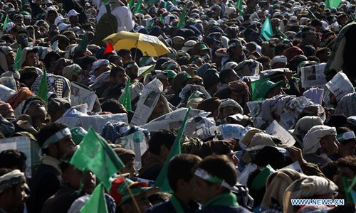 Yemeni people take part in a rally to celebrate the Islamic Prophet Muhammad's birthday in Sanaa, Yemen, on Nov. 9, 2019. Thousands of people packed al-Sabeen Square in Sanaa on Saturday to celebrate the Prophet Muhammad's birthday despite the security tensions in the country. (Photo by Mohammed Mohammed/Xinhua)