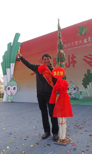 A farmer poses with his award-winning green onion that is drapped in a red ribbon in Zhangqiu, East China's Shandong Province. He won 30,000 yuan ($4,200) for growing the tallest green onion which measured at almost 2.5 meters tall. Photo: IC