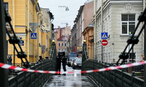 Russian police block a bridge over the Moika River during searches operation conducted by Russian emergency rescuers and police investigators on the river, in Saint Petersburg, on Sunday. Photo: AFP