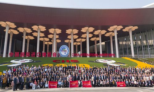 Staff members pose for a photo at the south square of the National Exhibition and Convention Center in Shanghai, east China, the main venue for the second China International Import Expo, Nov. 10, 2019. (Xinhua/Cai Yang)